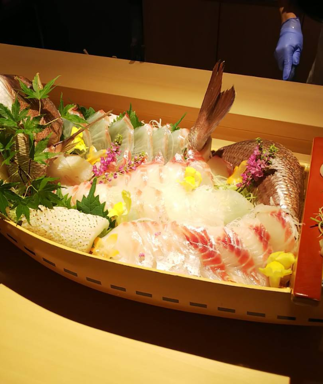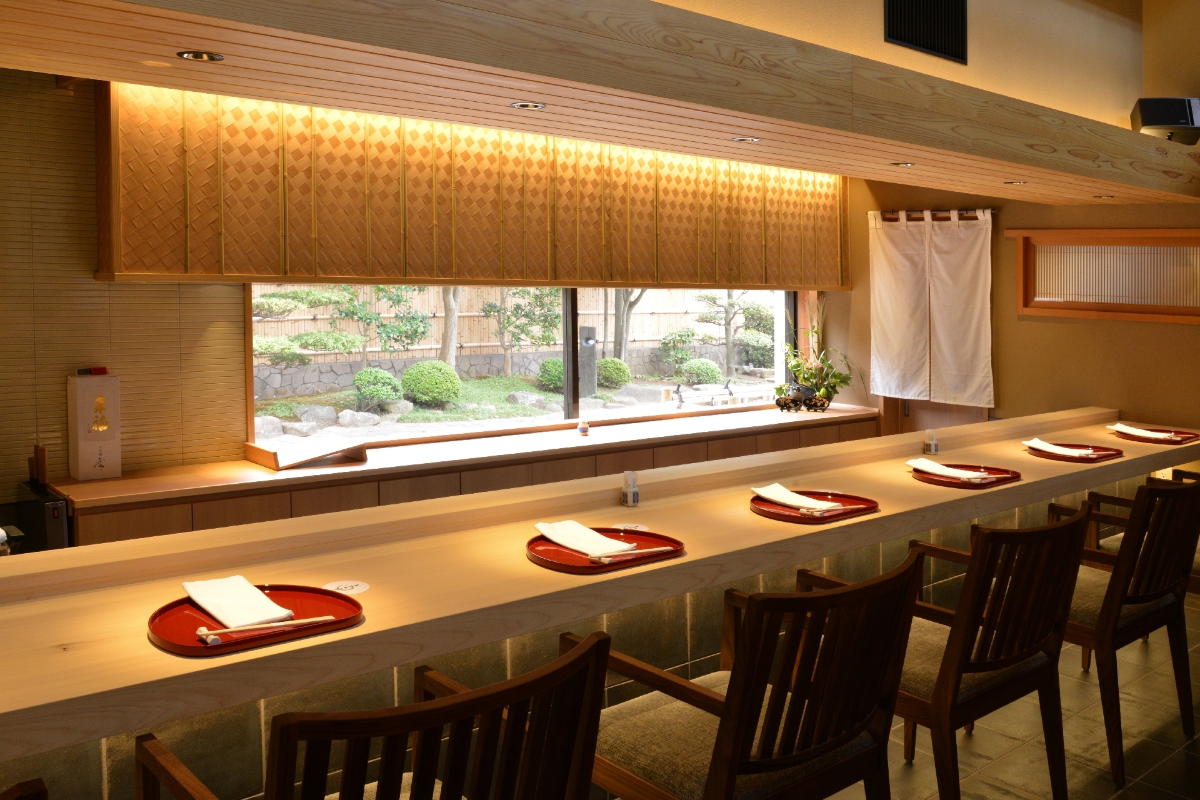 京料理 真砂家がこだわる落ち着いた雰囲気のカウンターテーブル。昼席では大きな窓から差し込む光と緑を、夜席ではほんのり差し込む外の明かりを背に板長が腕を振るいます。