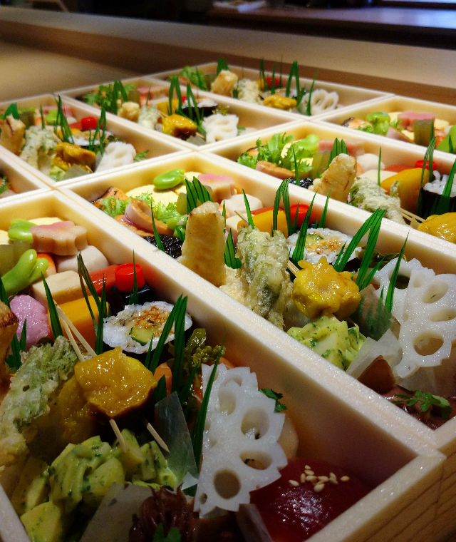 京料理をご自宅で・・・ご自宅やお土産として、家族や友人と京料理をお楽しみ頂けます。お弁当は3,500円~(税込3,780円)、オードブルは6,000円~(税込6,480円~)お持ち帰りは2日前のご予約が必要となります。お気軽にお問い合せください。